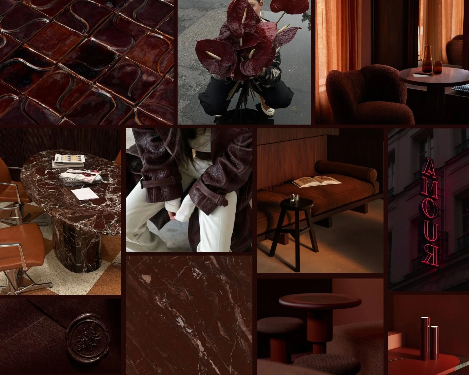 For branding, oxblood adds weight, texture, and memorability. It pairs beautifully with neutrals, metals, stone, and natural materials — ideal for designers drawn to understated uniqueness, romance, and a touch of mystery. In interiors, it becomes a grounding anchor or a dramatic accent that adds warmth without ever shouting.